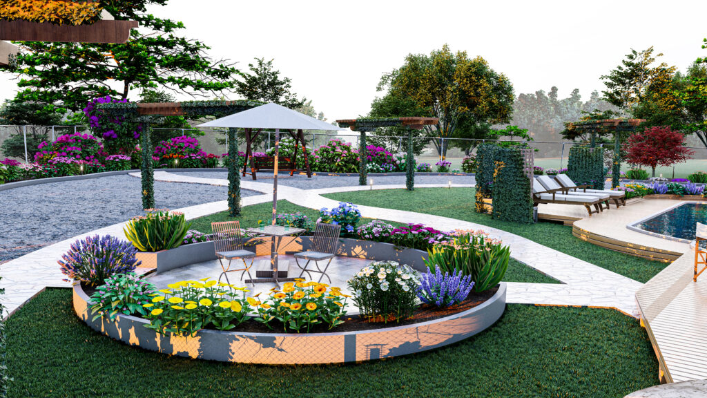 Select heat-resistant materials for outdoor furniture and flooring. Use pergolas with retractable shades or climbing plants to provide relief from the sun. Position seating areas strategically to enjoy the best views of the garden.
