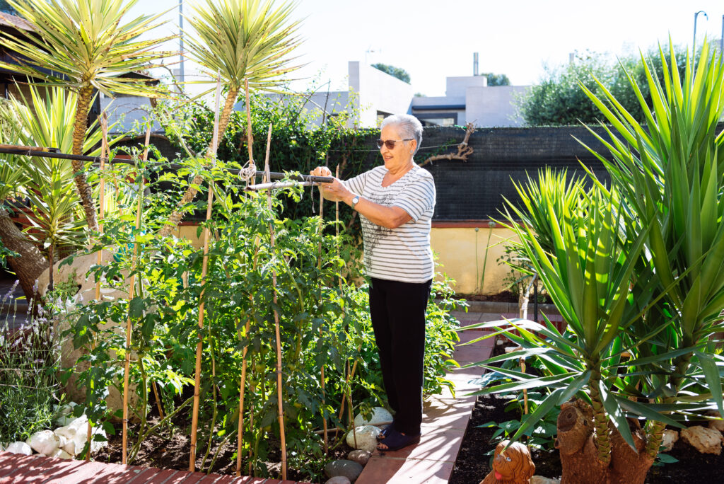 Full body of mature female farmer mounting support stick to small green unripe tomatoes while taking care of plants in garden in village